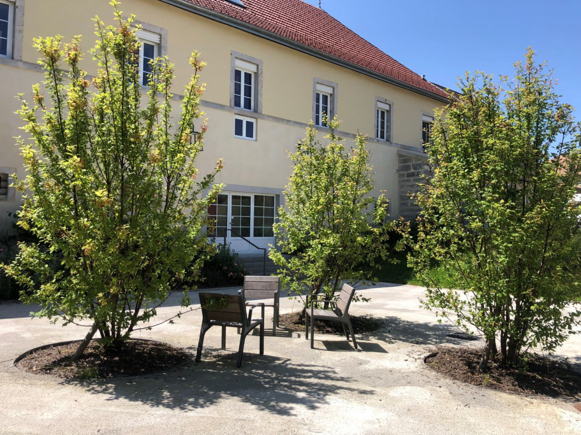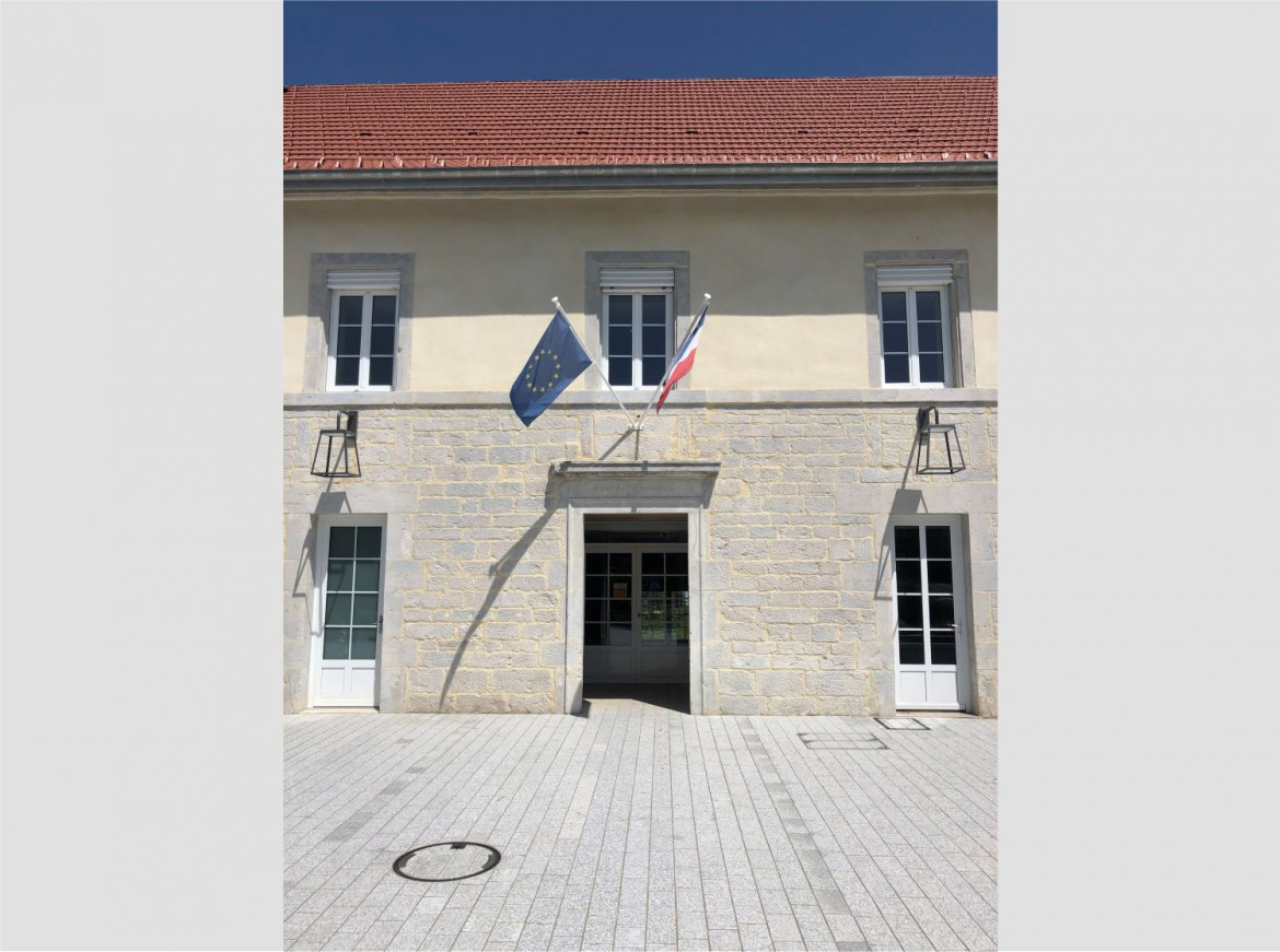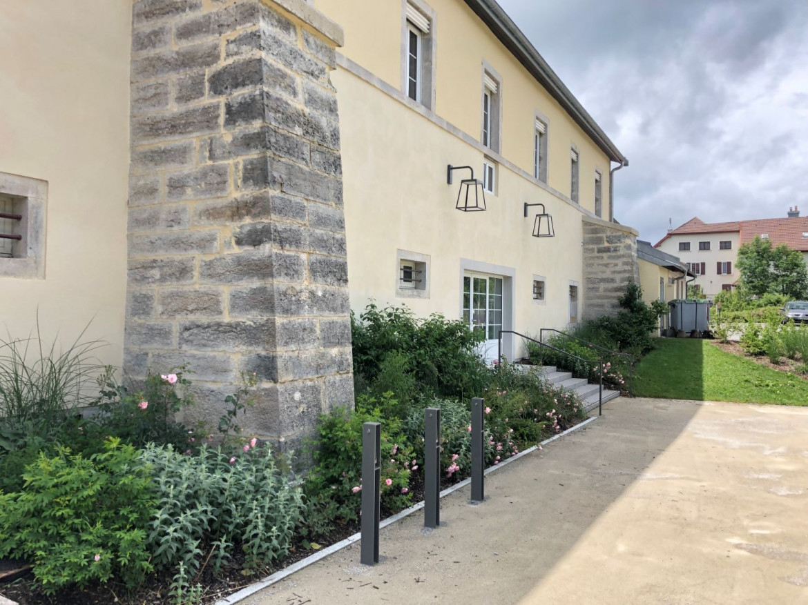 Le projet préserve l’identité forte de la bâtisse centrale, au cœur d’Amancey, datant de l’époque napoléonienne. Les pierres ont été nettoyées par sablage et les joints refaits à neuf dans le ton de l’enduit. Des brises soleils orientables en façade Sud répondent à la protection à l’ensoleillement. Des lambrequins, au style modestement moderne, rappellent ceux existants dans nos bâtisses anciennes avec des lignes horizontales épurées. Des luminaires viennent entourer les fenêtres mettant en valeur, le soir venue, le patrimoine bâti. Des lanternes ponctuent la façade sur parvis.