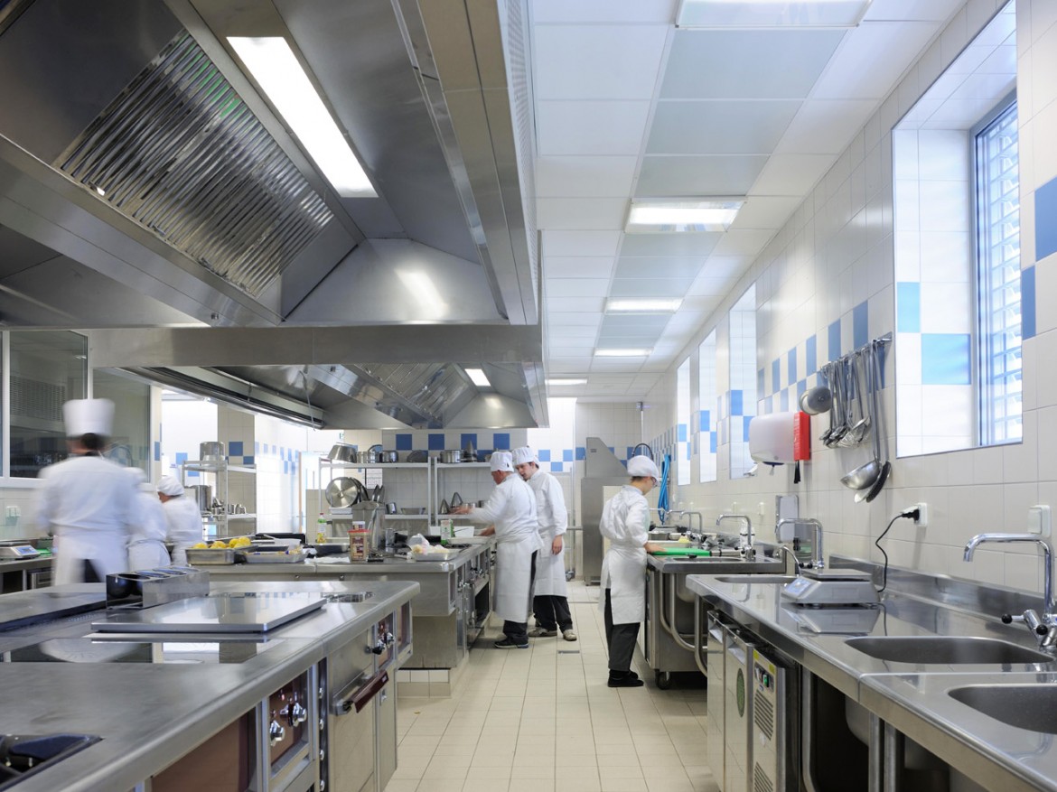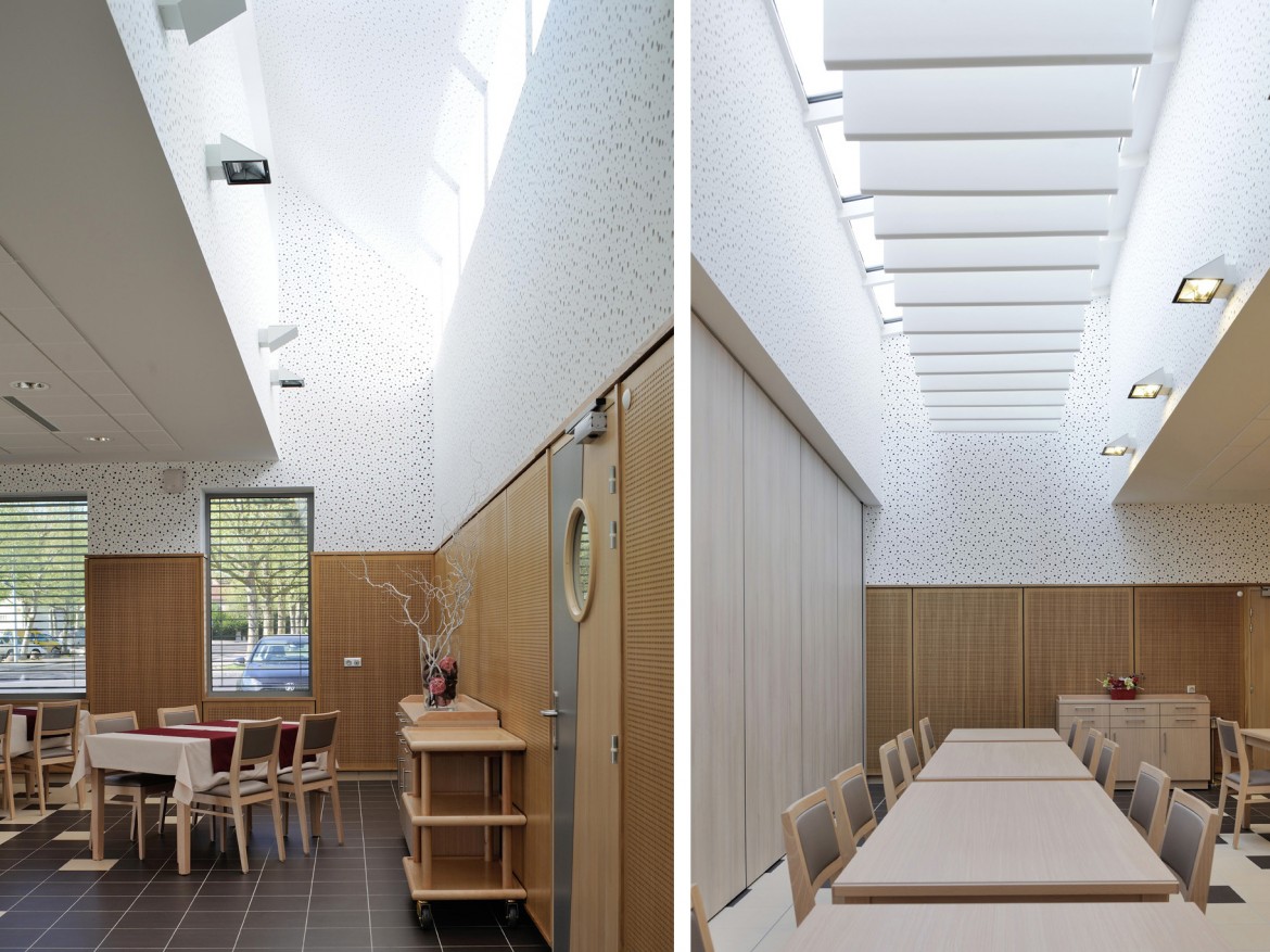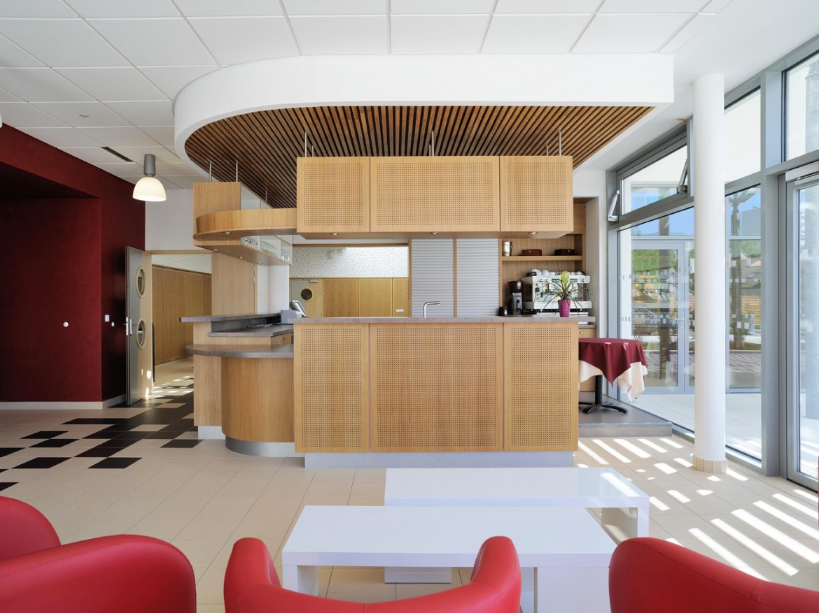 L'ensemble offices/cuisines se trouve au centre du bâtiment. À l'étage sont réunies l'ensemble des salles formant un plateau technologique, directement accessible depuis la circulation principale et le hall à rez-de-chaussée. Toute la technique est concentrée sur le toit.