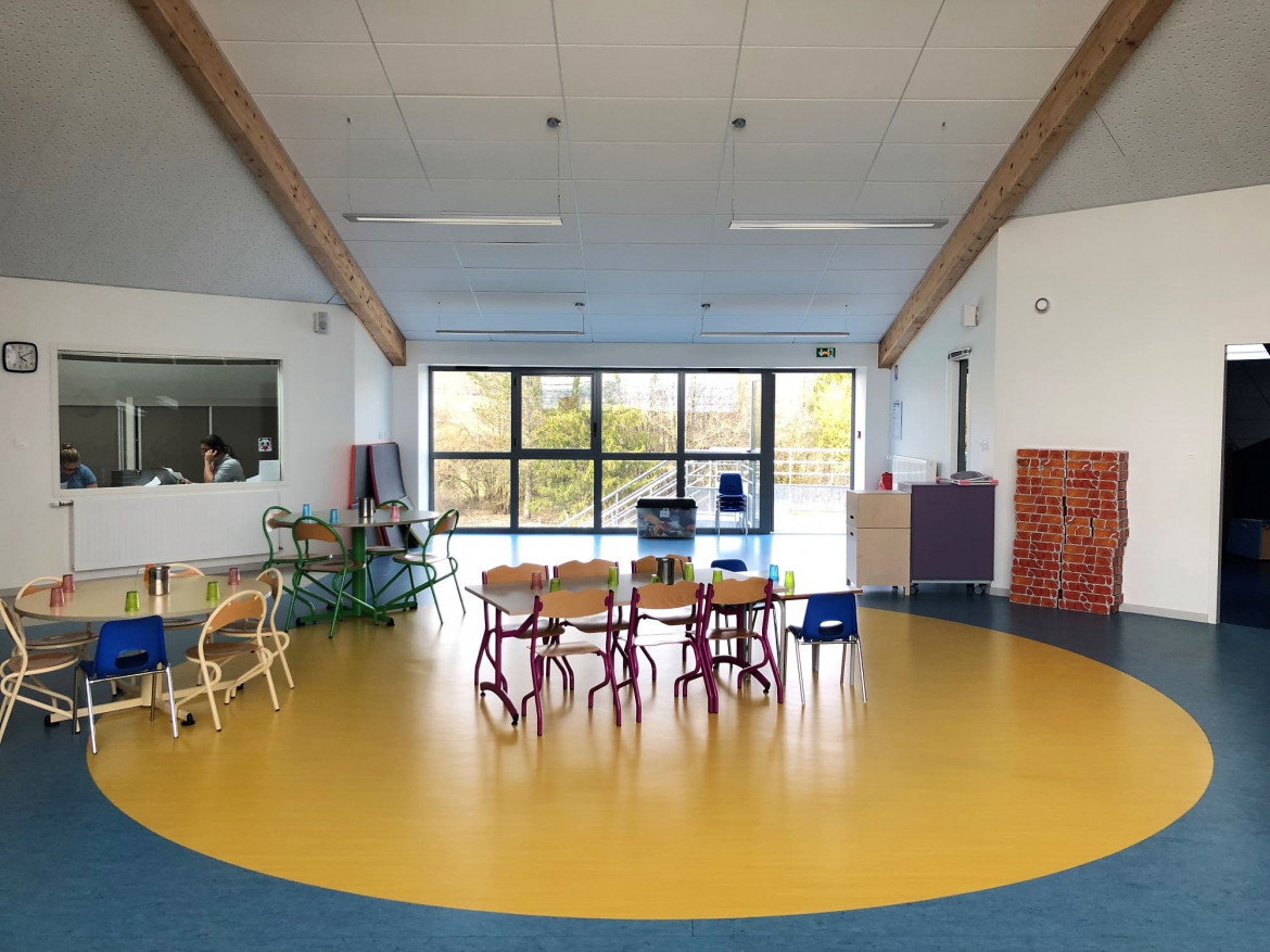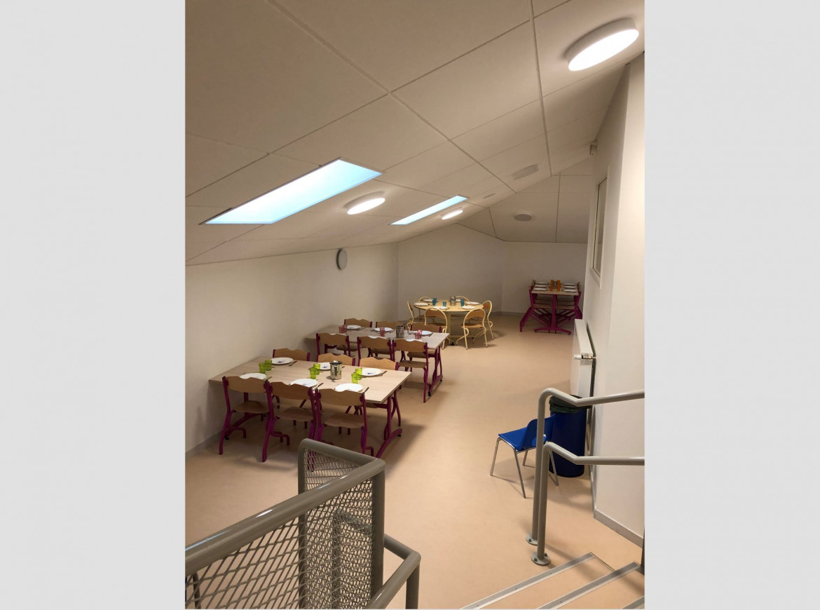 La salle de restauration est attenante, d’un espace permettant de recevoir 2 services d’un total de 75 enfants.