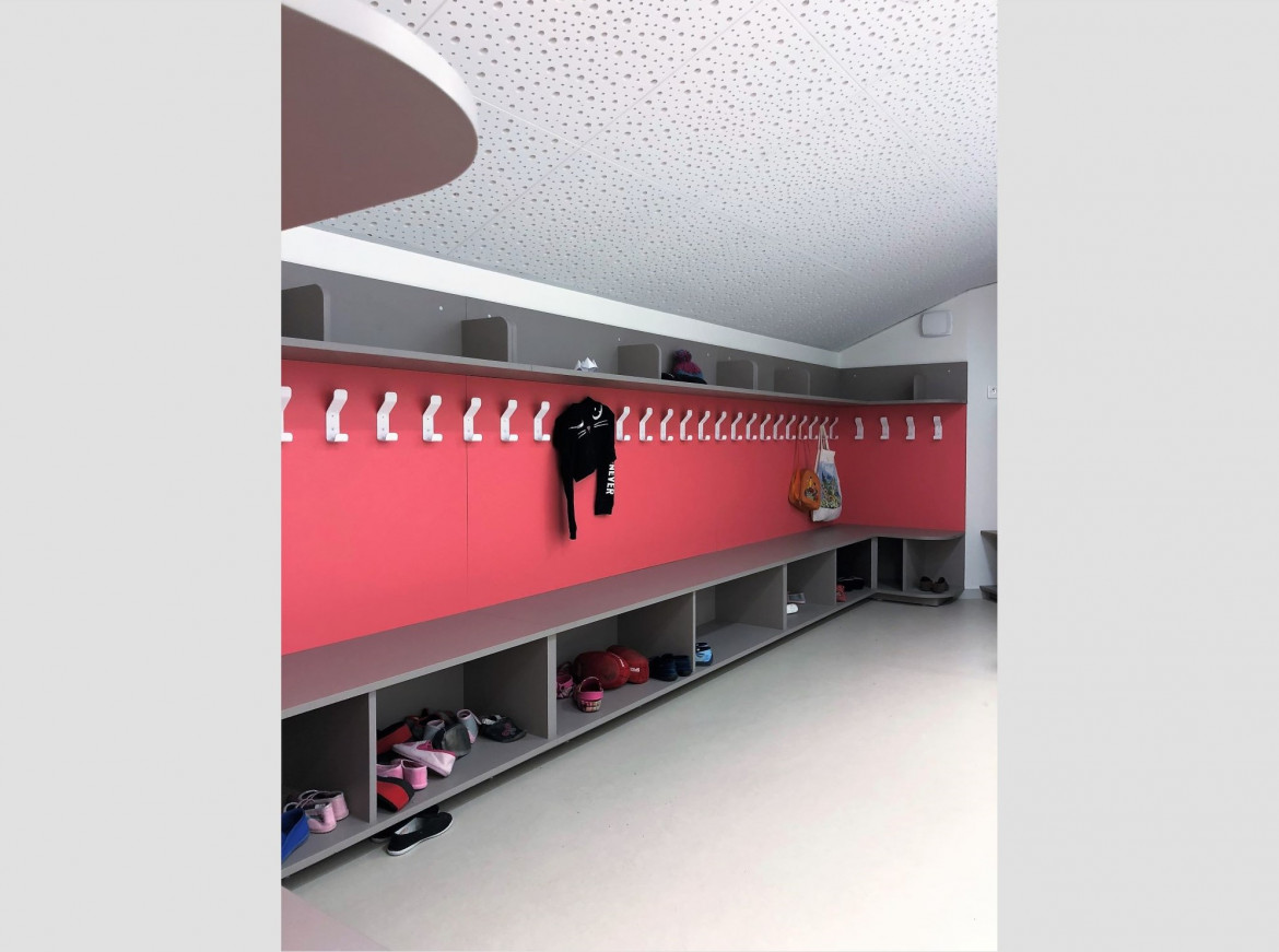 L’acoustique est traité par des panneaux type gyptone démontable, décorant aussi l'espace. Différentes teintes de sols souples délimitent les différents espaces et mettent de la gaîté par leurs aspects colorés.